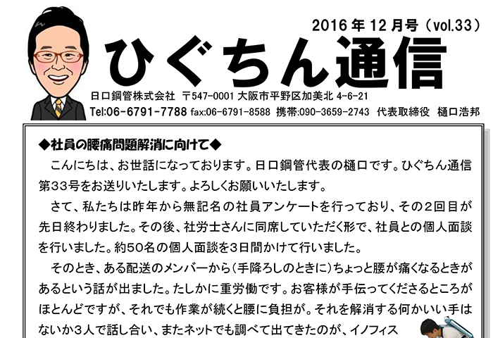c15:ひぐちん通信 ひぐちん通信 vol.33 を公開しました。 2016.12.16 2025.09.19 c15:ひぐちん通信 📄 PDFでご覧いただけます。 4-丸パイプ ロール切断:19.1×1.2 前の記事 5-バタ角パイプ・対角切り 次の記事 関連記事 ひぐちん通信 vol.15 を公開しました。 2015.06.15
