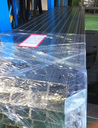 片方を45°に切断して、端から端まで抜かずにカスタムスリット加工しています。スリットは、隣の面にS2(90°)で加工しています。ラッピングをしていますのでよく見えないと思いますが、そういう別注抜きであります。